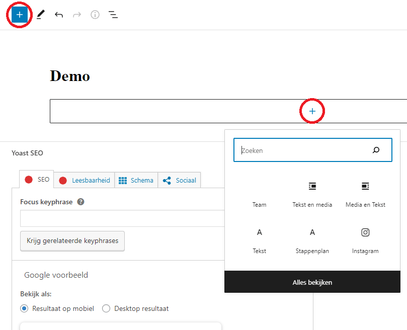 Druk op de blauwe knop met een + erin of bovenin de pagina en kies het blok die je wilt toevoegen. Je hebt de keuze uit de blokken die wij op maat voor jouw website hebben gemaakt. Het is niet mogelijk om zelf een Gutenberg blok aan te maken. Als je een wens hebt voor een nieuw Gutenberg blok, neem dan contact met ons op en we bespreken samen de mogelijkheden.